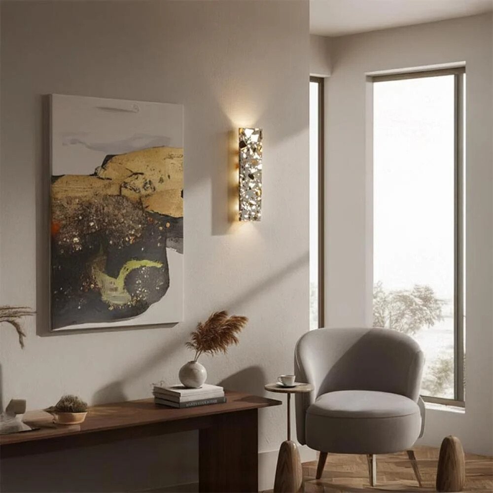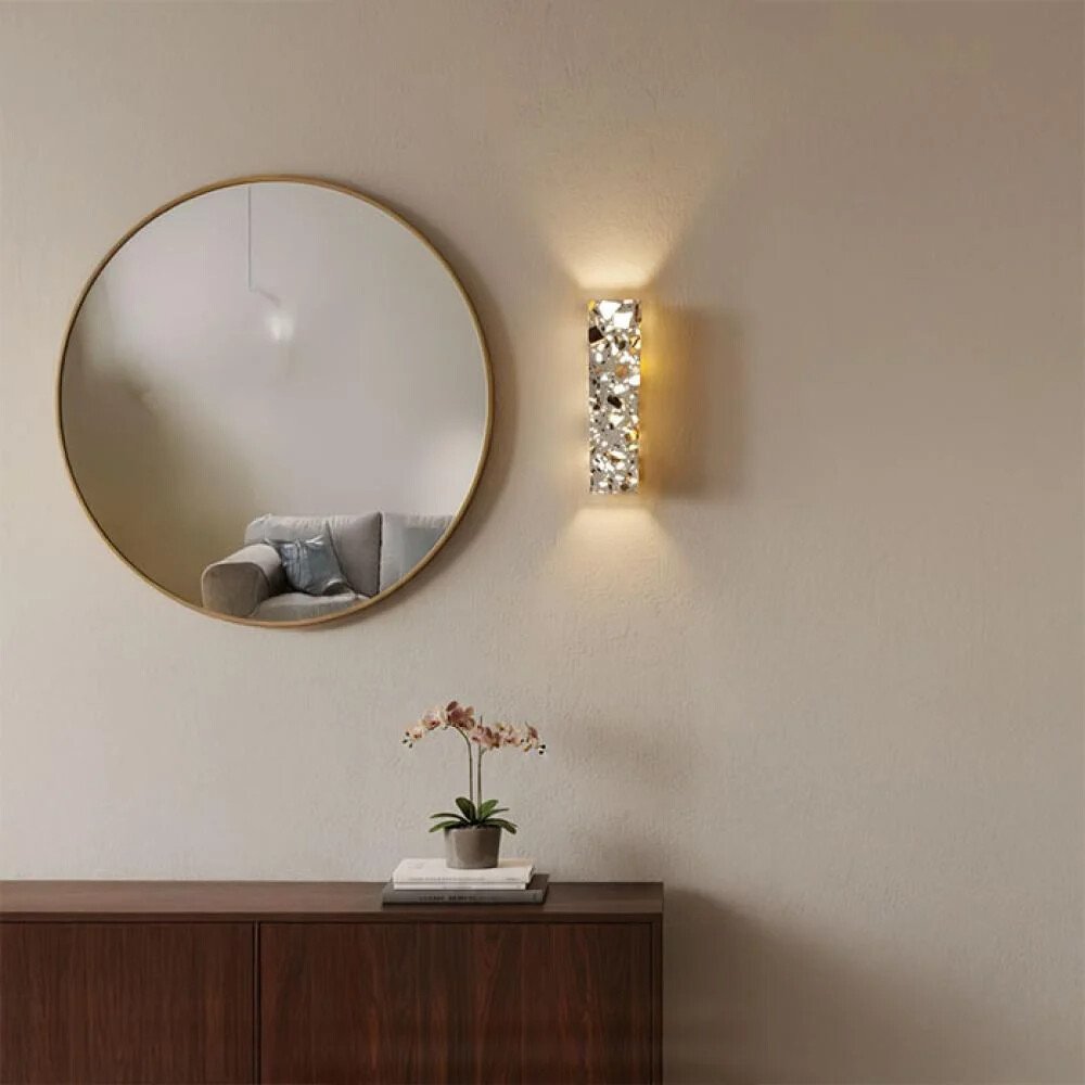 أبليك جداري فاخر بتصميم عصري أنيق يجمع بين البساطة والفخامة، يتميز بهيكل معدني ذهبي مع واجهة كريستالية شفافة بتقطيع هندسي يعكس الضوء بأسلوب متلألئ وجذاب. يوزّع الضوء بشكل علوي وسفلي ليخلق هالة ضوئية ناعمة على الجدار، مما يمنح المكان إحساسًا بالرقي والدفء في آنٍ واحد.