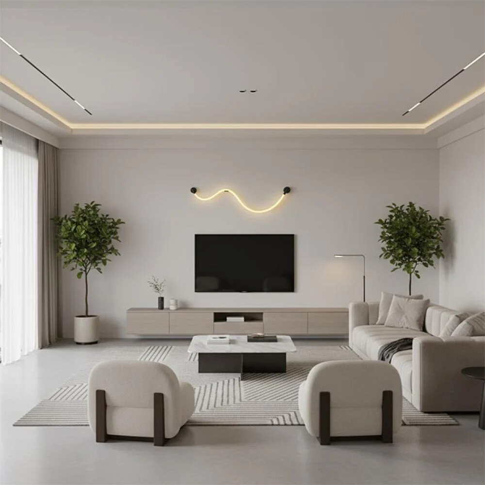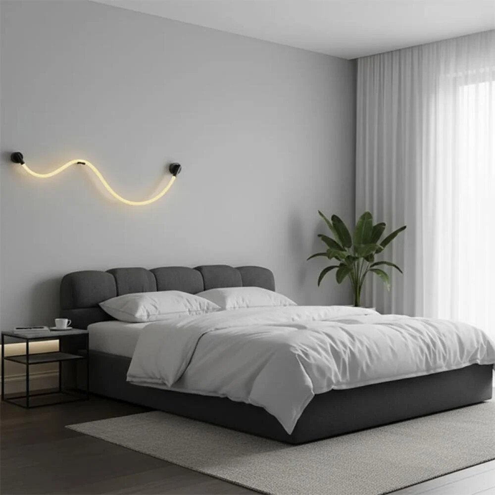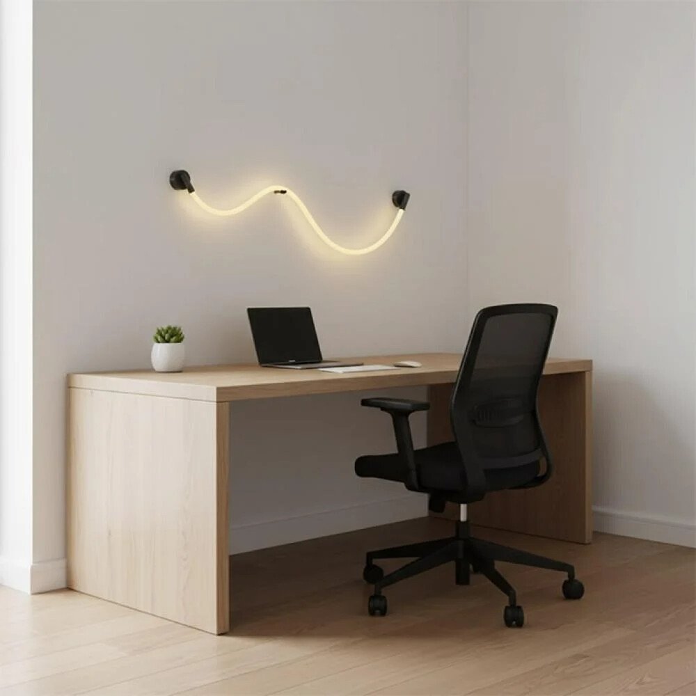 أبليك جداري عصري بتصميم مبتكر على شكل خط ضوئي مرن ومتعرّج، يجمع بين البساطة الفنية والوظيفة العملية. يتميّز بسلك إضاءة LED مرن يمكن تشكيله بحرية ليأخذ منحنيات ناعمة تضيف لمسة فنية حديثة على الجدار، مع قواعد تثبيت سوداء أنيقة تعزز الطابع الصناعي العصري.